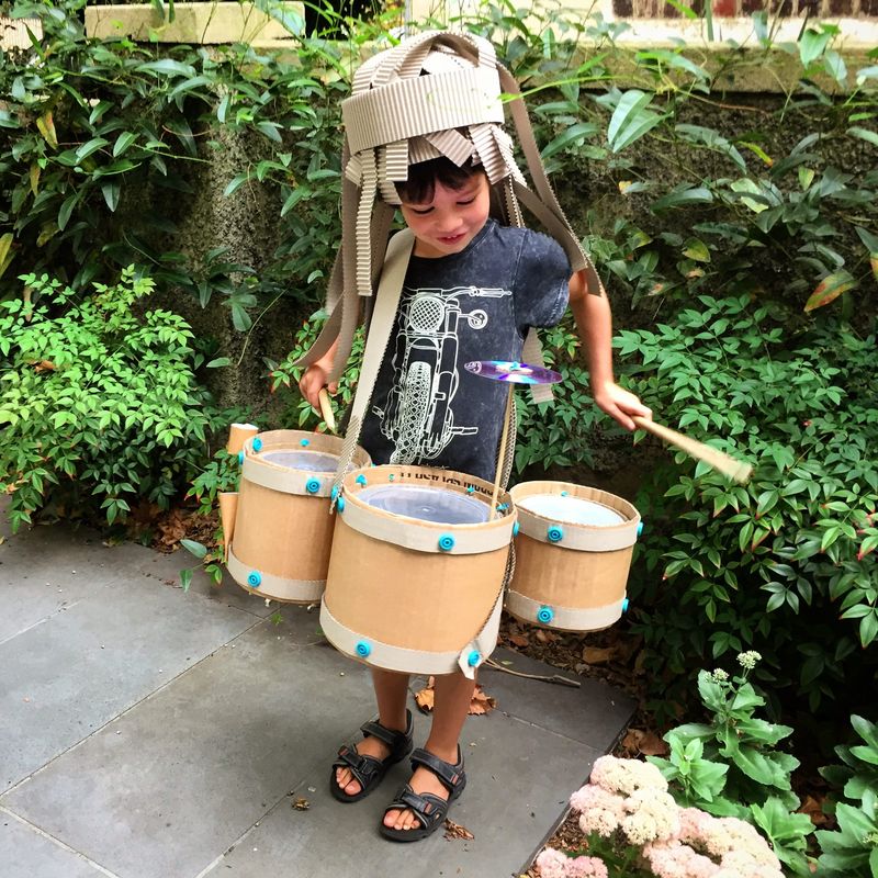 This young musician enlisted the help of a parent to make a portable cardboard drum kit, and to complete the musician vibe, he also requested long cardboard hair!