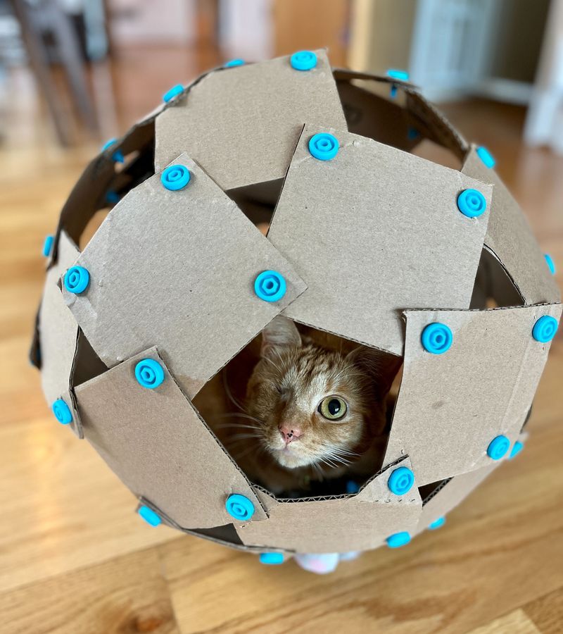 Cat families know how much their pets love to be inside a cardboard Makedo creation. So when Sarah made a mini Windball for little one-eyed Joey, it was no surprise that he was over (or could we say inside?) the moon with excitement over this new space to play.