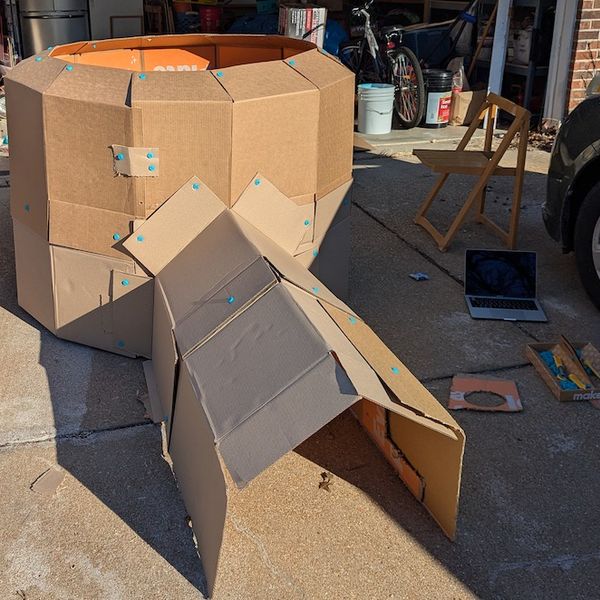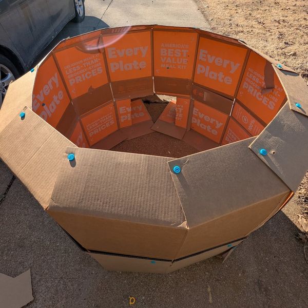 This careful planning in the early stages (and a little help from Dad) enabled Makedo maker Rush from Missouri, USA to build a very cool cardboard fort. The neat structure makes good use of the existing folds in the food delivery boxes that the family had collected. It looks like this Makedo construction was as much fun to build as it would be to play in afterwards!